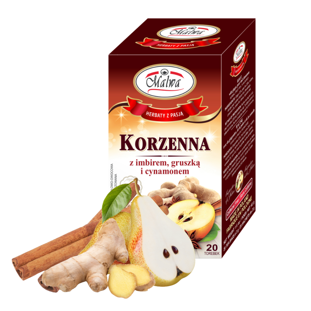 Herbatka Ziołowo-owocowa Korzenna Z Imbirem ,gruszką I Cynamonem 20 Torebek Malwa – Gwarancja Prawdziwego Smaku Prosto z Natury – Dla Aktywnych i Dbających o Linię