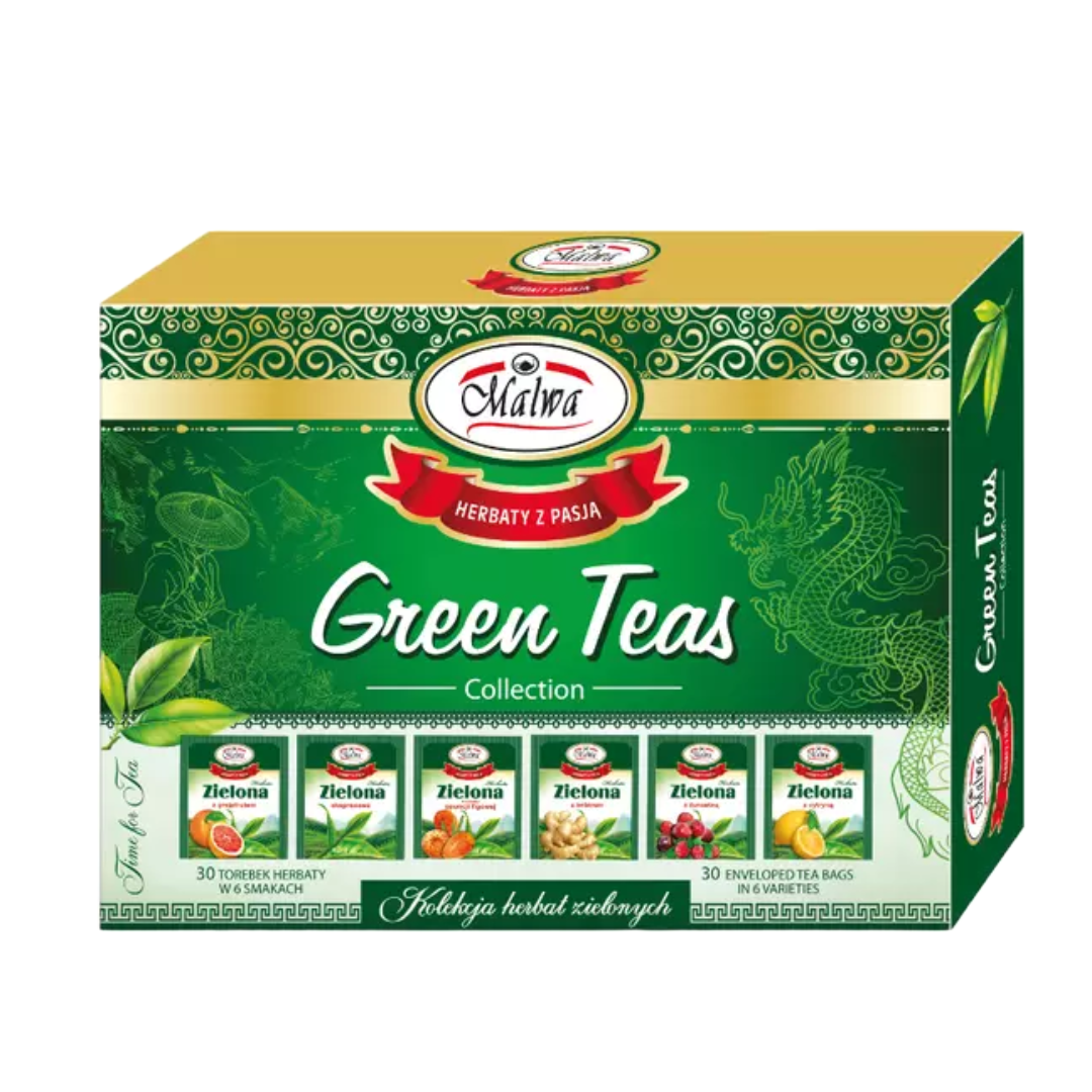 Kolekcja Herbat Zielonych Green Teas Bombonierka 30 Torebek Malwa – Bezpieczny Wybór Dla Ciebie i Twojej Rodziny – Dla Wegan i Wegetarian